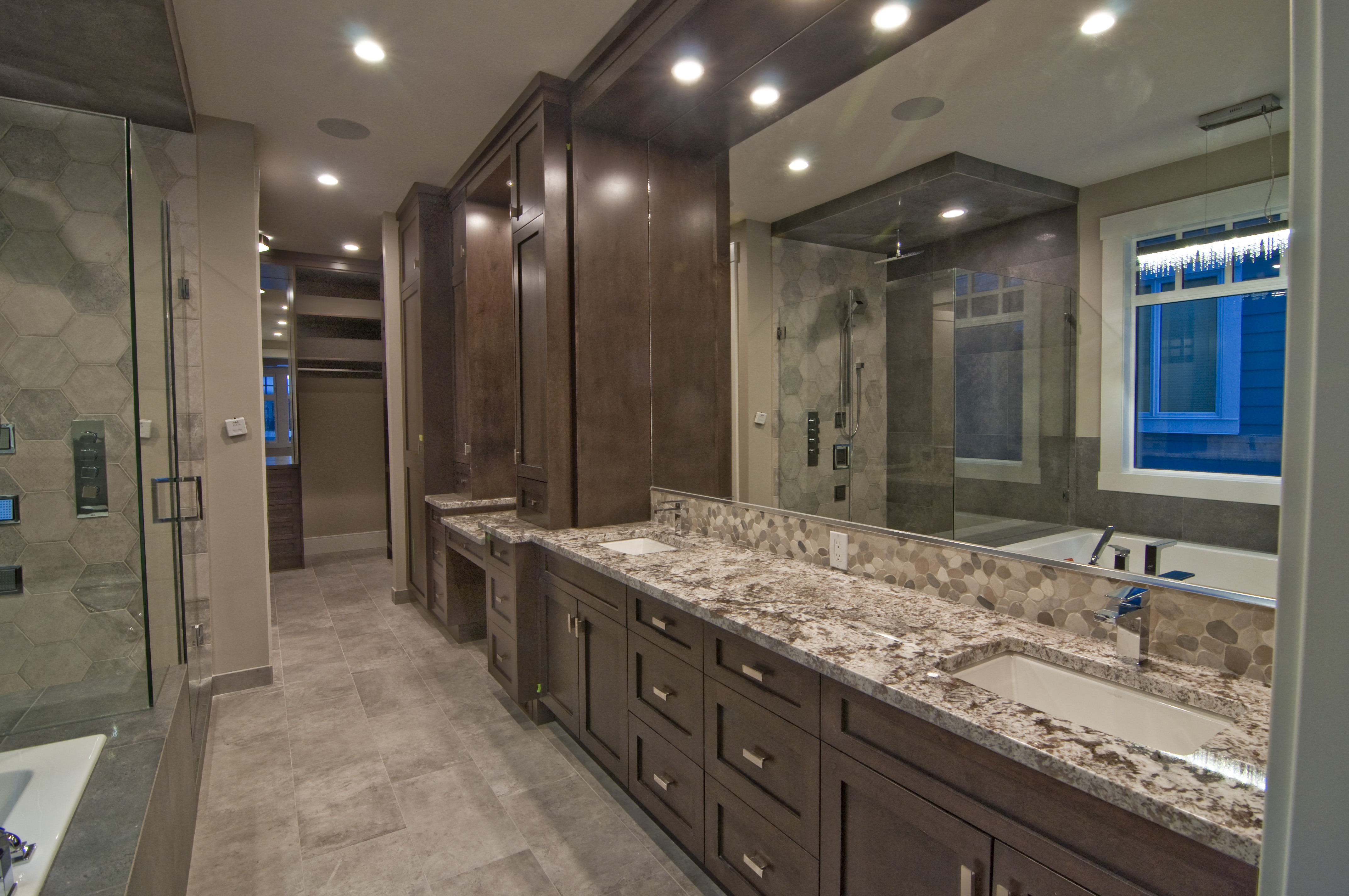 - Custom crafted vanity cabinets with attached make-up counter